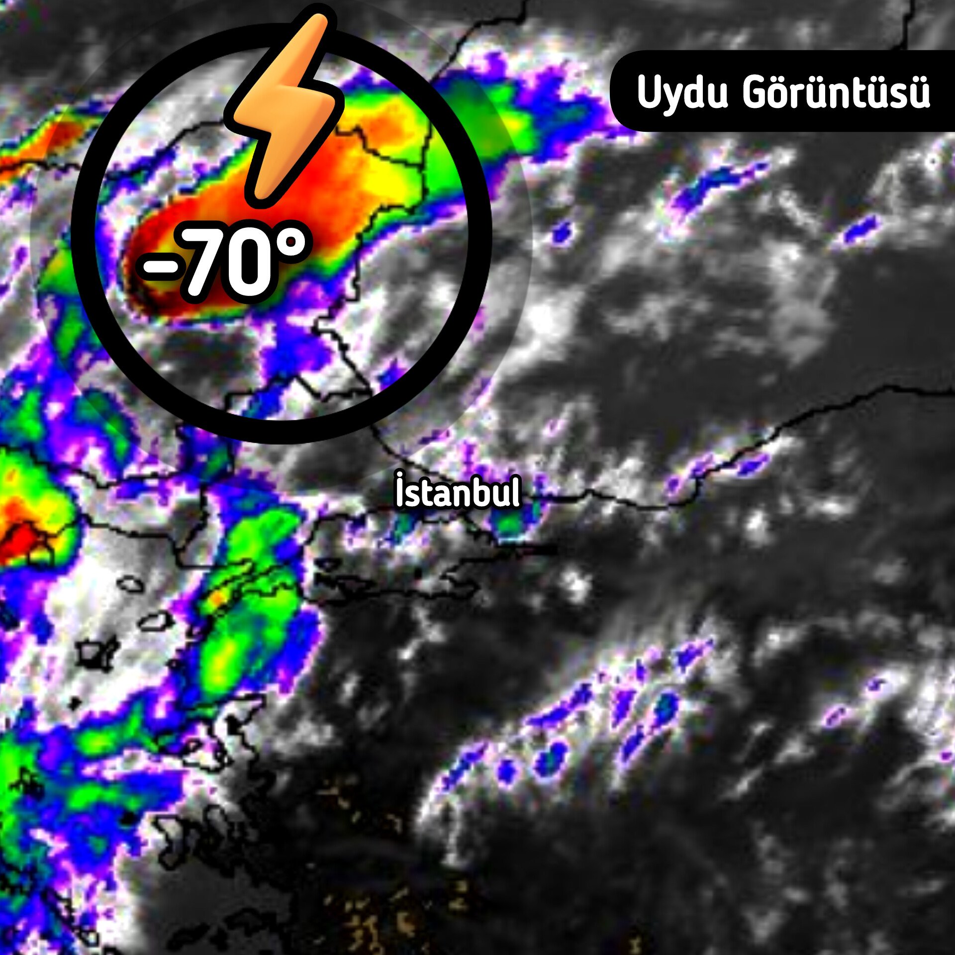 Komşu Bulgaristan’da ikinci kez bulut tepe sıcaklığı -68/-70 derece olarak ölçüldü. Bu durumun ardından dolu, sağanak, şimşek ve yıldırım olayları yaşandı. Fırtına sınırımıza yakın bir bölgede bulunuyor.