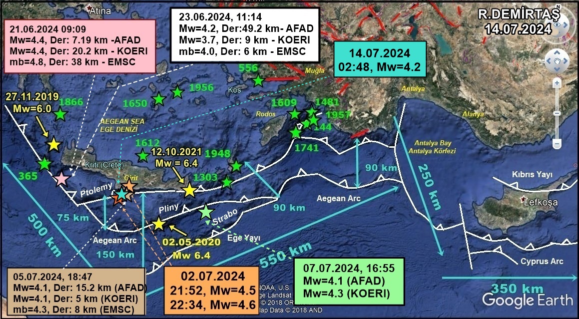 Girit Adası’nın güneyindeki Ptolemy Çukurluğu’nda 14 Temmuz 2024’te saat 02:48’de 4.2 büyüklüğünde bir deprem oldu. Bu, hazırlık evresi depremlerinin devam ettiğini gösteriyor.