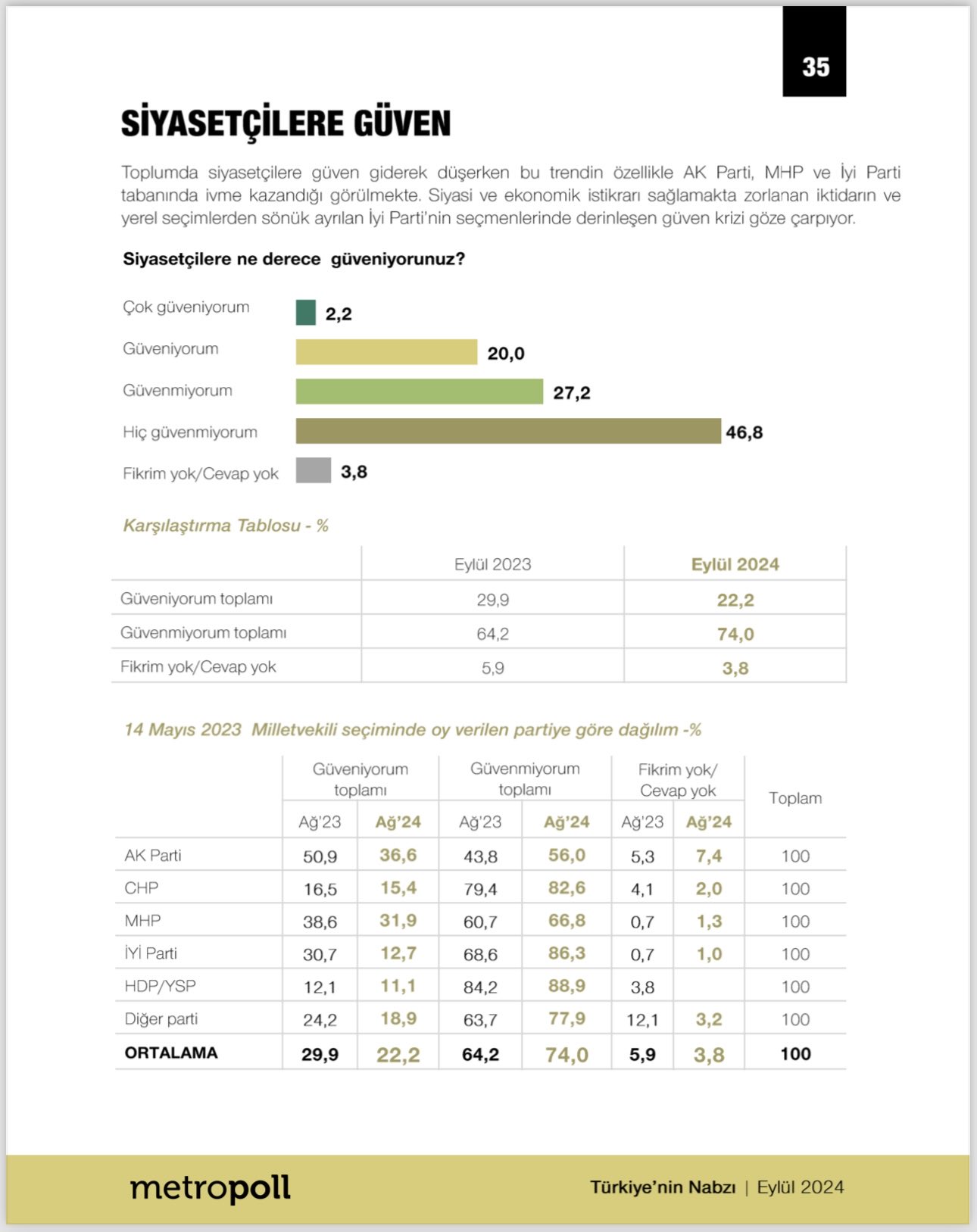 14 Mayıs 2023’teki milletvekili seçimlerinde oy verenlerin güven düzeyleri de analiz edildi. AK Parti seçmenleri arasında güven azaldı. Eylül 2024‘te AK Parti’ye güven oranı yüzde 36,6’ya geriledi. Benzer şekilde MHP ve İYİ Parti seçmenleri de güvenlerini kaybetti. İYİ Parti seçmenlerinde “güvenmiyorum” diyenlerin oranı yüzde 68,6’ya yükseldi.