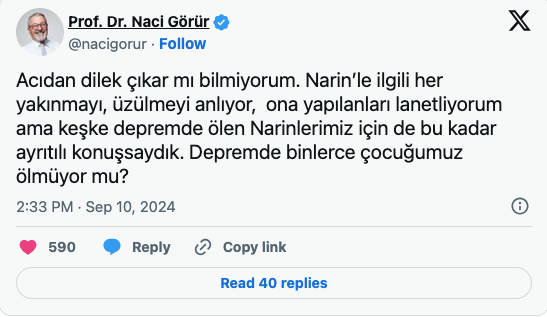Prof. Dr. Naci Görür, sosyal medya hesabından yaptığı açıklamada, Narin için gösterilen üzüntü ve tepkilerin depremde kaybedilen çocuklar için de yapılması gerektiğini belirtti.